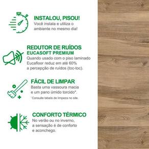 Recomendações de Uso, Manutenção e Limpeza: A limpeza deve ser feita com aspirador de pó (exceto aspiradores com tubo de sucção que raspam o piso) ou vassoura de cerdas macias e um pano úmido bem torcido em solução de produtos domésticos de limpeza isentos de cera ou silicone. Eventualmente (uma vez por semana), a limpeza poderá ser feita diluindo uma ou duas tampas do Pratice Limpador de Laminados ou detergente neutro em 1 litro d'água. Molhe o pano nesta mistura, torça-o bem e aplique sobre o piso.Nunca utilize material cortante ou abrasivo, cera ou enceradeiras elétricas, esponja de aço, lixa ou produtos à base de silicone