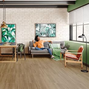 A tonalidade Freijó Âmbar destaca veios madeirados e aquece o ambiente, combinando bem com móveis claros ou escuros em salas, quartos, corredores e escritórios.