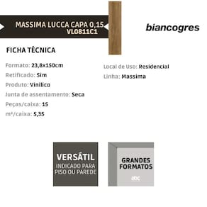 O Piso Vinílico Biancogres Massima Lucca une sofisticação e praticidade em um revestimento de alto desempenho, ideal para quem busca beleza, conforto acústico e fácil manutenção. Seu design remete à textura e aparência da madeira natural, trazendo aconchego e elegância aos ambientes residenciais e comerciais leves.