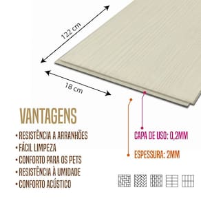 Ao contrário do piso clicado, o piso colado necessita de um adesivo para realizar a sua fixação. Exige um contrapiso perfeitamente nivelado e liso para que a superfície fique plana após a sua instalação. O piso vinílico colado é a opção perfeita para quem quer criar uma paginação diferenciada, aberta e exclusiva. Acabamento: Texturizado Acompanha Ficha Técnica: Não Acompanha Manual de Instalação: Não Ambiente Principal: Quarto Ambientes Recomendados: Área Comercial/Área Residencial Aparência: Madeira Capa de Uso de PVC: 0,02 mm Comprimento: 122 cm Conforto térmico: (4) Médio - Alto Cor: Mont Blanc Cor do Produto: Mont Blanc Cor Predominante: Cinza Escala de Brilho: Acetinado Largura: 18 cm Manual de Montagem e Instalação: https://product-hub-prd.madeiramadeira.com.br/927145429/documents/f14a74d0-19ba-4130-bd21-33a7a7d348c13076494654517527596354619.pdf Marca: Formaco Decor m² por caixa: 4,645 m² Origem do Produto: Nacional País de Origem: Importado Peso: 1,75 kg/m² Proteção Superficial: Sim Tipo de Instalação: Colado Tipo de Piso Vinílico: Régua Tom de cor: Claro Valorização do imóvel: (4) Médio - Alto Marca: Não Informado