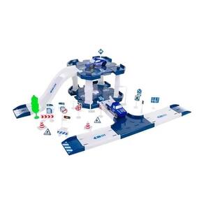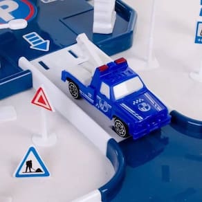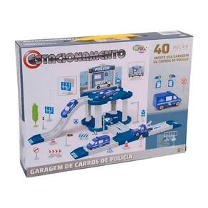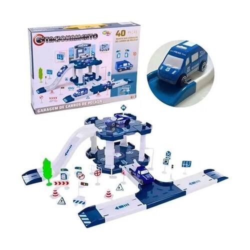 Pista com Estacionamento de Brinquedo Policial com 40 Peças Pista com Estacionamento de Brinquedo Policial com 40 Peças ===================================== O kit contém 40 peças variadas, incluindo rampas, estradas, placas de sinalização, barreiras, acessórios decorativos e dois carrinhos inclusos, permitindo que a criança crie diferentes trajetórias e simule situações reais do trânsito.