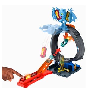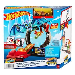 Pista Hot Wheels Ataque Loop Do Morcego. Corrida para vencer o morcego que atacou a loja de pneus Hot Wheels City. O conjunto apresenta três maneiras de jogar: Lançar no loop para nocautear a criatura, mirar diretamente e lançar para acertar o morcego com um salto legal ou correr sob o loop para se concentrar no jogo de pista.O grande loop de pneus gira para jogos e desafios mais dinâmicos, e as crianças podem ajustar o lançador para direcionar a ação. Conecte o conjunto a outras faixas e cenários de Hot Wheels para aventuras de narrativa abertas. Conjuntos adicionais vendidos separadamente. Com 1 carro Hot Wheels incluído, a Hot Wheels Ataque Do Morcego é um ótimo presente para qualquer ocasião!