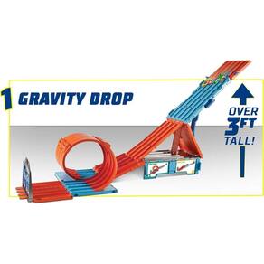 -A pista dobrável, com mais de 2,45 m de comprimento, e os diversos desafios estimulam a imaginação, com a barreira para largadas justas, loops em duas faixas, a barreira alvo e duas rampas de largada duplas para saltos.