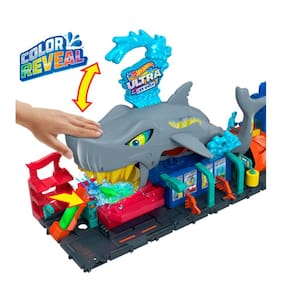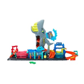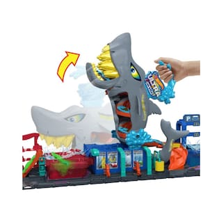 Hot Wheels City Lava-Rápido Mega Tubarão foi tomado por um enorme tubarão que está querendo mergulhar em uma ação de mudança de cor! As crianças dirigem o veículo sobre a rampa e na boca do tubarão, depois pressionam a cabeça do tubarão para mudar a cor na água e revelar a decoração do carro. Puxar o tubarão para cima permite que você veja o carro correr por suas entranhas enquanto o excesso de água é drenado. Tocar a cauda do tubarão permite lançar os carros para uma surpresa de mudança de cor.