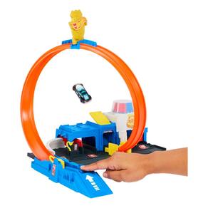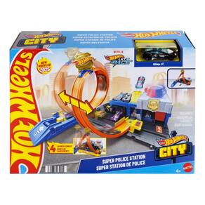 Há quatro maneiras diferentes de correr e fazer acrobacias no conjunto Hot Wheels City Super Delegacia de Polícia com sua pista ajustável! Você pode dirigir o carro de polícia de brinquedo fundido em escala 1:64 incluído no lançador, onde há uma mangueira flexível para reabastecer antes de entrar em ação. Você pode deslizar a pista em loop para um dos quatro caminhos - cada um mostra uma acrobacia ou um resultado diferente. Estacionar até quatro veículos no conjunto e conectar outras pistas e conjuntos permite uma brincadeira sem limites. Um carro está incluído; veículos e pistas adicionais são vendidos separadamente. As cores e as decorações podem variar.Inclui 1 Hot Wheels City Super Delegacia de Polícia com carro de polícia em escala 1:64.