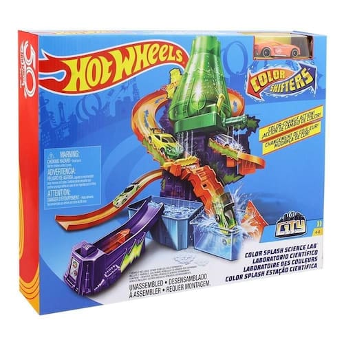 Descubra muita diversão com esta estação científica, onde loucas experiências com cores podem sair do controle um cientista maluco prendeu um carro color shifters sob a cachoeira de mudança de cor, e está exeprimentando todos os tipos de combinações insanas de cores você consegue ajudar o carro a escapar Descubra neste passeio cheio de aventuras lance para a ação, correndo com o carro pela pista e liberte-o. Ah não parece que o cientista maluco encurralou você aperte a alavanca de liberação e solte o carro no tanque abaixo, para que sua cor volte ao normal. As crianças vão adorar a emoção ao tentar escapar do laboratório do cientista maluco, enquanto observam as mais piradas combinações de cores.