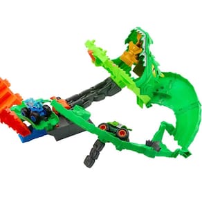 Eles correm pelas entranhas do dragão, onde um desviador de motosserra escolhe aleatoriamente um dos três resultados: reter os dois Caminhões, tirar um deles da pista ou deixar que ambos escapem para derrotar o nêmesis. Quando o dragão desmorona, as crianças podem se lançar em sua boca e reivindicar o troféu. Dois Hot Wheels Monster Trucks em escala 1:64 estão incluídos.