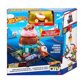 AVISO: Imagens meramente ilustrativas!! Delicie-se brincando com as pistas do conjunto Hot Wheels City Downtown Ice Cream Swirl! O conjunto em forma de cone de sorvete conta com um elevador movido pela criança que gira os carros para cima, pelo sorvete e até a rampa dobrável para aventuras ainda mais deliciosas. O brinquedo inclui um carro Hot Wheels e se conecta a outros conjuntos. Passe pelo desviador de placas e entre no cone e, em seguida, gire o logotipo Hot Wheels para mover o carro Hot Wheels pela pista em espiral e desça a rampa para mais aventuras. Marca: MattelMaterial: PlásticoRef: HTN77Idade: 4+Comp. Carrinho apróx: 4,5cm Ean: 194735195077