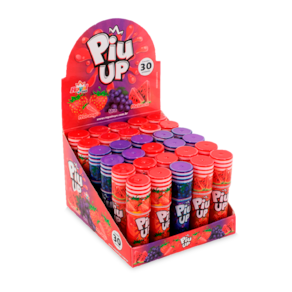 Experimente a diversão e o sabor com o Piu Up, o pirulito infantil de dedo que está fazendo o maior sucesso entre as crianças! Este display vem com 30 unidades de 10g cada, oferecendo uma variedade de sabores artificiais deliciosos de morango, uva e melancia.