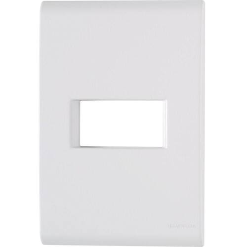 Placa 1 Posto Horizontal 4x2 Tramontina Liz Branca Placa 1 Posto Horizontal 4x2 Tramontina Liz Branca Os ambientes vão ficar muito mais práticos e cheios de estilo com a Placa 1 Posto Horizontal 4x2 Tramontina Liz Branca. No modelo 4x2, ela apresenta um posto horizontal para utilização dos módulos largos da Linha Liz. É produzida com a qualidade do termoplástico e possui acabamento brilho na cor branca, característica que não retém poeira. Pode ainda ser trocada por outras cores da linha, garantindo versatilidade e muito mais estilo. Possui sistema modular em duas peças: placa e suporte, tendo um ajuste entre ambos que torna o acabamento entre a placa e a parede muito mais perfeito, pois não deixa frestas; além de poder ser fixada em paredes de madeira. Possui furo oblongo que facilita a fixação e a regulagem da placa à parede, deixando-a reta, além de deixar o visual ainda mais especial, pois a fixação não é aparente. Uma peça essencial para espaços organizados e práticos, que acompanha suporte e parafusos para a instalação.