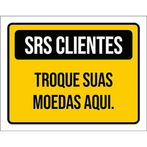 Placa Amarela Srs Clientes Troque Suas Moedas Aqui 36x46 Informações do Produto: Placas decorativas fabricadas com poliestireno de alto impacto PSAI de 2mm e impressão ultravioleta. - Medidas: 36cm x 46cm - Fixação: Todas as placas possuem adesivo dupla face para aplicação em qualquer tipo de superfície lisa. de 12 meses e disponibilidade imediata. Marca: Não Informado