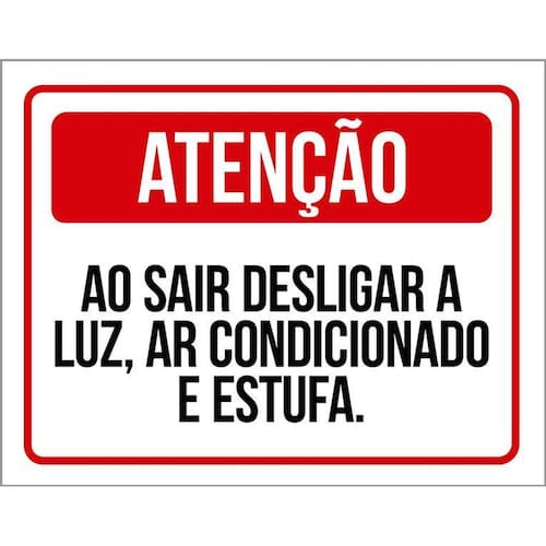 Placa Atenção Ao Sair Desligar Luz Estufa 36x46 Informações do Produto: Placas decorativas fabricadas com poliestireno de alto impacto PSAI de 2mm e impressão ultravioleta. - Medidas: 36cm x 46cm - Fixação: Todas as placas possuem adesivo dupla face para aplicação em qualquer tipo de superfície lisa. de 12 meses e disponibilidade imediata.