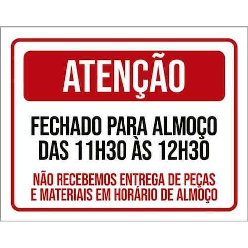 Placa Atenção Fechado Almoço Não Receberemos 36x46 Placas de sinalizaço fabricadas com poliestireno de alto impacto PSAI de 2mm e impressão ultravioleta.