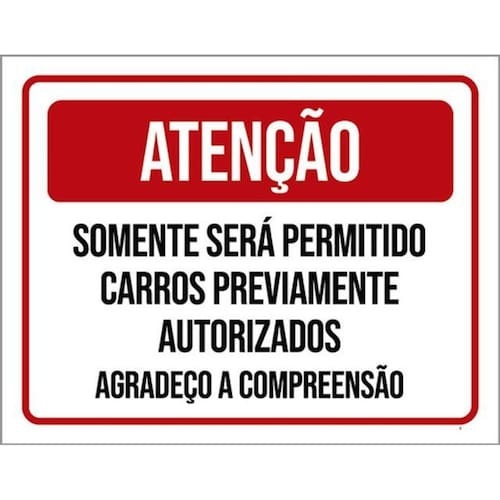 Placa Atenção Somente Permitidos Carros Autorizados 36x46 Placas de sinalizaço fabricadas com poliestireno de alto impacto PSAI de 2mm e impressão ultravioleta.