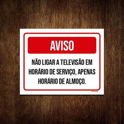 Placa Avio Não Ligar Televisão Em Horário De Serviço 27X35 Placas decorativas fabricadas com poliestireno de alto impacto PSAI de 2mm e impressão ultravioleta. - Medidas: 27cm x 35cm - Fixação: Todas as placas possuem adesivo dupla face para aplicação em qualquer tipo de superfície lisa. de 12 meses e disponibilidade imediata. Marca: Não Informado