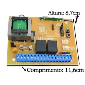 Especificaçõs Técnicas: - Para motores de até 1/2 CV em 127 / 220 V - Transformador de 120 mA - Conector luz e trava (é obrigatório o uso do CLG - circuito luz de garagem) A2993 - Conector A/F (abertura e fechamento) - Embreagem eletrônica digital - Ajuste de pausa / percurso / força / freio por trimpot - Fácil programação de até 62 controles remotos. Podendo expandir para 900 controles remotos com o módulo expansor de memória (vendido separadamente) - Dimensões: Comprimento 11,5cm x Largura 8,7cm x Altura 3,5cm
