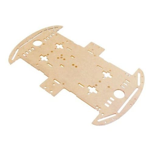 Cortado à laser em acrílico transparente. Maior resistência mecânica., possui furação universal para que possa se parafusar todos os demais acessórios do carro-robô (suporte de pilhas, motores, roda-guia, Arduino, etc).