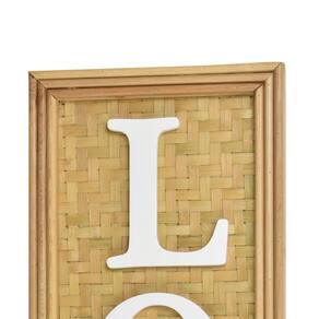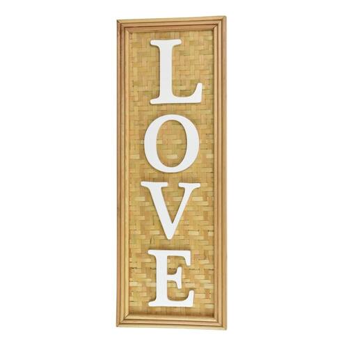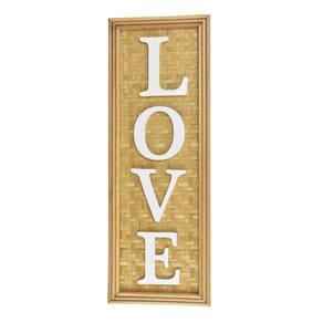 Placa de decoração de parede Benjara Love, fundo de madeira marrom de 10 x 28 polegadas, tecido branco