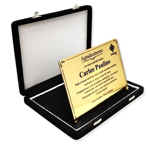 Celebre momentos especiais com nossa placa de homenagem em acrílico e seu elegante estojo. Feita com precisão e qualidade, esta placa é o presente perfeito para diversas ocasiões: Dia do Professor, Dia do Padre, Dia do Médico, Dia do Profissional de Saúde, Dia do Amigo, Dia do Agricultor, Dia dos Pais, Dia das Mães e muitos outros. Reconheça o esforço, a dedicação e o comprometimento daqueles que fazem a diferença em nossas vidas e comunidades. Seja para homenagear serviços prestados, demonstrar companheirismo, amizade ou reconhecimento por obras realizadas, nossa placa é a escolha ideal. Honre os verdadeiros heróis do dia a dia. Garanta a sua hoje mesmo!