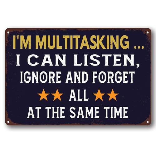 Tamanho: 20x30 cm (8x12 polegadas) Peso: 150 g Material: ferro Embalagem: 1 x pôster de pintura em ferro perfeito para: casas, escritórios, bares, cozinhas, restaurantes e muito mais. Arte humorística de parede: esta placa de metal multitarefa mostra uma citação espirituosa: “Sou multitarefa... Eu posso ouvir, ignorar e esquecer tudo ao mesmo tempo.” É uma adição divertida e identificável a qualquer espaço, perfeita para provocar uma risada. Construção em ferro de qualidade: feita de ferro de alta qualidade, esta placa de metal leve e durável foi projetada para uso a longo prazo. É resistente ao desgaste e às intempéries, o que o torna uma escolha confiável para exibição interna ou externa. Perfeita para vários espaços: ideal para sua casa, escritório, cozinha, bar ou mancaverna, essa arte de parede humorística traz um toque de personalidade e diversão a qualquer espaço. Também é um ótimo presente para amigos ou colegas. Fácil de pendurar: orifícios pré-perfurados em cada canto permitem uma fácil instalação. Use pregos, parafusos ou fita dupla face para pendurar a placa onde quiser, aprimorando sua decoração com o mínimo esforço. Peça de decoração versátil: esta placa de lata adiciona um toque retrô à decoração minimalista ou industrial. Seja exibido em uma sala de estar, sala de jantar ou espaço de trabalho, ele traz um charme da velha escola com um toque humorístico.