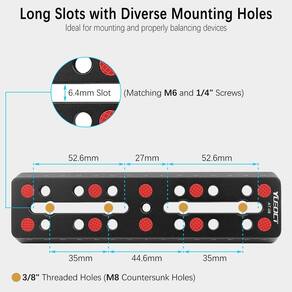 Com dois slots longos de 52,6 mm/2,07", ideais para montar e balancear dispositivos adequadamente. As ranhuras têm 6,4 mm de largura e aceitam parafusos M6 e 1/4"-20. Além disso, há dois orifícios rosqueados de 3/8"-16 (orifícios escareados M8) com um espaçamento de 35 mm em cada ranhura.