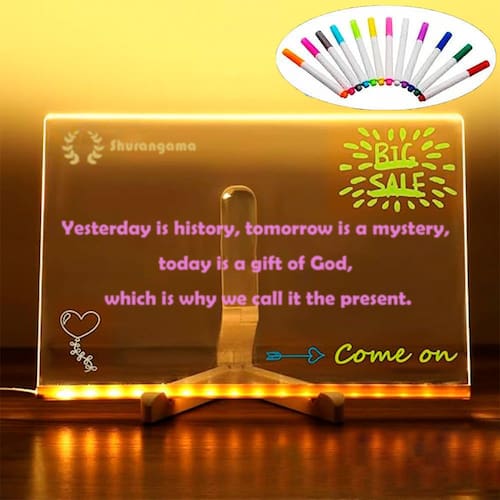 O quadro de notas de LED com cores é feito de material acrílico de alta qualidade, forte e durável. A placa de acrílico apagável a seco é alimentada por USB. Quando conectado à fonte de alimentação, ele emitirá uma luz uniforme, garantindo que suas informações e design brilhem em qualquer ambiente. - Para garantir que sua prancha permaneça tão brilhante quanto suas ideias, recomendamos usar um pano úmido para apagar. Este passo simples ajuda a evitar arranhões que possam prejudicar a aparência elegante da placa. Para uma limpeza mais completa, sinta-se à vontade para lavar a tábua com água da torneira. Seu design durável permite que seja utilizado várias vezes, sempre pronto para sua próxima grande ideia. - ?Quadro de acrílico apagável a seco com iluminação?Crie mensagens sinceras ou desenhos vibrantes no quadro de notas Shurangama LED. Seu brilho colorido torna cada nota especial, perfeita para a família ou sua cara-metade. - ?Presentes de Natal perfeitos para crianças?Deixe as crianças explorarem sua criatividade, afastando-se das telas. Este quadro ilumina sua imaginação, tornando cada esboço uma obra-prima luminosa. - ?Quadro de mensagens multifuncional?Organize o seu dia com um toque de cor. A placa de LED é a sua escolha para anotar planos, garantindo que você fique no caminho certo com seus objetivos e estudos. - ?Quadro de mensagens de acrílico brilhante?Marque datas importantes com luz. Este quadro serve como um lembrete brilhante de ocasiões especiais, ajudando você a planejar e celebrar sem perder o ritmo. - ?Luz noturna de LED criativa para quadro de notas?Ideal para bares, hotéis e restaurantes, este quadro apresenta menus e ofertas em uma luz única. Fácil de limpar e carregado por USB, é uma adição versátil a qualquer espaço.