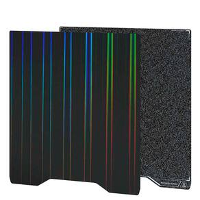 Plataforma de impressão 3D com dupla funcionalidade, composta por filme PET com textura "Pilar de Luz", colorida de um lado e superfície PEI fosca do outro. Oferece versatilidade para diversos tipos de filamentos, com troca rápida entre os lados, alta aderência e fácil desmoldagem.