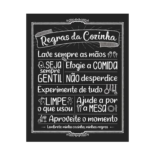 A Placa Decorativa 20x25 Regras da Cozinha da Estúdio Amora é impressa direto no material com Impressão UV, que garante maior durabilidade e resistência contra desbotamento das cores e imagens. E para facilitar a sua vida, já vem acompanhada de fita dupla face, pronta para aplicação!