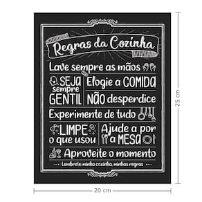 Detalhes do Produto: - Material: MDF 3 mm - Tamanho: 20 cm x 25 cm - Peso Líquido: 134 gramas - Tema: "Regras da Cozinha" - Conteúdo da Embalagem: 1 placa decorativa com fita dupla face