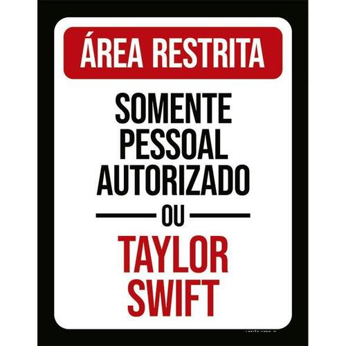 Placa Decorativa - Área Restrita Taylor Swift 36x46 - Informações do Produto: Placas decorativas fabricadas com poliestireno de alto impacto PSAI de 2mm e adesivo vinil automotivo de alta performance. - Medidas: 36cm x 46cm - Fixação: Todas as placas possuem adesivo dupla face para aplicação em qualquer tipo de superfície lisa. de 12 meses e disponibilidade imediata. Marca: Não Informado Ean: 7794724274924