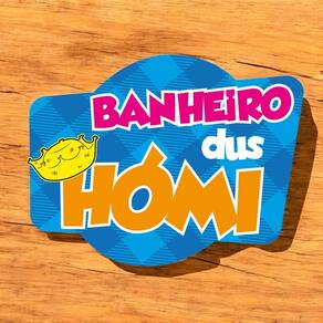 Fundo azul com estampa xadrez, remetendo ao estilo caipira. Texto chamativo e divertido: BANHEIRO em vermelho, dus em branco e HÓMI em laranja com contorno branco. Ilustração de um chapéu amarelo no canto esquerdo, reforçando o tema junino.