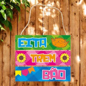 Placa Decorativa - Eita Trem Bão Deixe sua Festa Junina ainda mais animada com essa linda placa decorativa Com cores vibrantes e elementos típicos, ela traz toda a alegria e tradição dessa celebração tão especial. A placa é composta por três partes coloridas, cada uma com uma palavra estampada: EITA no fundo verde, acompanhado de um chapéu de palha. TREM no fundo rosa, decorado com girassóis. BÃO no fundo azul, com bandeirinhas festivas. Além do design encantador, o item conta com um cordão para pendurar, facilitando a decoração do ambiente. Informações do produto: Material: MDF/EVA Ideal para: Decoração de festas juninas, arraiais e ambientes temáticos Destaques: Cores vibrantes, elementos decorativos em relevo e fácil instalação Largura: 24 Comprimento: 20 Dê um toque especial ao seu evento e encante seus convidados com essa peça cheia de charme e tradição Marca: Não Informado Ean: 7899989341821