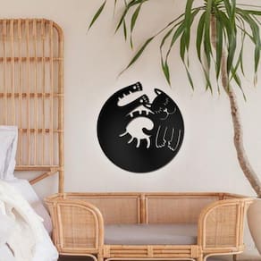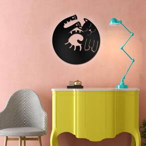 Especificações Técnicas: Medidas: comprimento: 30 cm altura: 3mm largura: 30 cm Material: mdf 3mm Cor: preto Tema: gato Formas de instalação: basta utilizar fitas dupla face Quantidade: 1 unidade