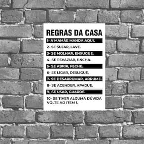 Placa decorativa regras da casa 18x27cm Informações do produto tire todas as suas dúvidas no descritivo abaixo: placas decorativas são tendência e uma excelente ideia para decorar ambientes de forma econômica e bonita, elas são leves e extremamente fáceis de instalar; além de servir para a decoração de qualquer ambiente, indo desde estabelecimentos como barbearias e bares, até quartos, sala, área de lazer, churrasqueira, etc. Ou ainda, e por que não, poder quebrar aquele galho tampando imperfeições indesejadas da parede com um toque especial medidas - cada peça tem 18x27cm. Material do papel - papel fotográfico brilhante de altíssima resolução - de 3 meses.
