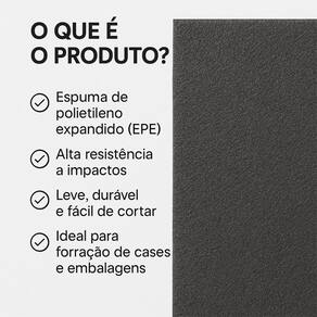Placa Ethafoam 1 Unidade EPE Espuma P/Case 60x50x4cm Grafite Descrição Se você precisa proteger objetos delicados no transporte ou na armazenagem, essa placa de espuma EPE polietileno expandido é a solução ideal Perfeita para forrar o interior de cases, maletas, embalagens técnicas, caixas organizadoras e muito mais. Como usar: Basta medir o interior do seu case ou maleta, cortar a espuma no tamanho desejado com estilete ou tesoura, e encaixar. Você pode também esculpir o formato exato do item que deseja proteger, garantindo um encaixe preciso e seguro. Dica: Use camadas de espuma para proteger equipamentos maiores ou mais frágeis, como instrumentos musicais, câmeras, drones, ferramentas e aparelhos eletrônicos. A densidade da espuma ajuda a absorver impactos e evitar danos. vantagens do produto: Alta resistência a impactos Leve, durável e fácil de manusear Pode ser moldada conforme a necessidade Células fechadas: não absorve umidade Cor grafite: visual discreto e profissional Seja para ou pessoal, essa placa de espuma é uma escolha inteligente para quem valoriza organização, segurança e acabamento de qualidade. Dimensões: Espessura: 4cm Largura: 50cm Comprimento: 60cm Contéudo: 1x Placa Ethafoam EPE Espuma Para Case 60x50x4cm Grafite Marca: Não Informado Ean: 7896918613189