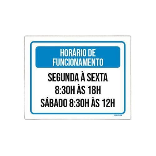 Características: - Placa decorativa Horário Segunda Sexa 8 As 18 Sabado 12 - Fabricadas em poliestireno de alto impacto - Ideal para decorar e organizar os ambientes - Impressão ultravioleta