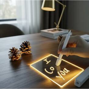 Placa luminosa LED em acrílico com base USB, ideal para recados, mensagens personalizadas e decoração. Possui superfície transparente para escrita com caneta fluorescente e iluminação colorida que destaca o texto. Perfeita para quarto, escritório, mesa de estudos e presentes criativos. Marca: Não Informado