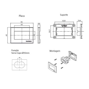 Placa para Móveis 65x45 com Intermediário MarGirius Sleek 10A Branca - Branco Características Gerais do Produto: Dimensões AxLxP mm : Placa: 45x65x6,6 - Suporte 32,7x52,8x14,4 Quantidade de Teclas: 1 Material: Placa em ABS com aditivo contra raio-uv e Suporte em PA6 30% fibra de vidro Acabamento: Alto Brilho Acompanha Placa: Sim Acompanha Suporte: Sim Tipo: Intermediário Acompanha Módulo: Sim Tamanho: 65x45 Furação: Serra Copo 35mm Corrente : 10A Linha: Sleek Quantidade de Módulos: 1 Acompanha o produto: 1 Placa para Móveis e Suporte 65x45 com Intermediário MarGirius Sleek : 5 anos junto ao fabricante Marca: Não Informado