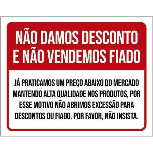 Placa Não Damos Desconto Não Vendemos Fiado 36x46 Informações do Produto: Placas decorativas fabricadas com poliestireno de alto impacto PSAI de 2mm e impressão ultravioleta. - Medidas: 36cm x 46cm - Fixação: Todas as placas possuem adesivo dupla face para aplicação em qualquer tipo de superfície lisa. de 12 meses e disponibilidade imediata. Marca: Não Informado