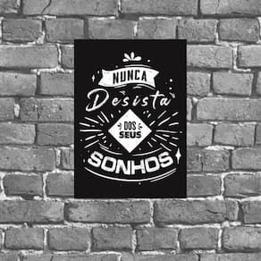 Placa nunca desista dos seus sonhos 18x27cm Informações do produto tire todas as suas dúvidas no descritivo abaixo: placas decorativas são tendência e uma excelente ideia para decorar ambientes de forma econômica e bonita, elas são leves e extremamente fáceis de instalar; além de servir para a decoração de qualquer ambiente, indo desde estabelecimentos como barbearias e bares, até quartos, sala, área de lazer, churrasqueira, etc. Ou ainda, e por que não, poder quebrar aquele galho tampando imperfeições indesejadas da parede com um toque especial medidas - cada peça tem 18x27cm. Material do papel - papel fotográfico brilhante de altíssima resolução - de 3 meses.