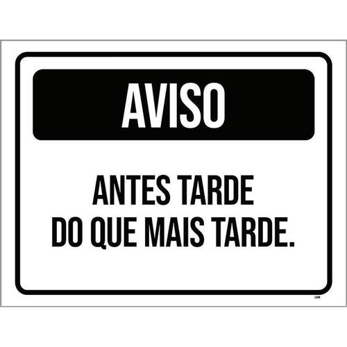 Placa preta - aviso antes tarde do que mais tarde 18x23 Não precisa furar, não empena e nem perde a cor no sol, pode ser rebitada e não rasga - informações do produto: Placas decorativas fabricadas com poliestireno de alto impacto psai de 2mm e adesivo vinil automotivo de alta performance. - medidas: 18cm x 23cm - fixação: Todas as placas possuem adesivo dupla face para aplicação em qualquer tipo de superfície lisa. de 12 meses e disponibilidade imediata. Marca: Não Informado Ean: 7793660841788
