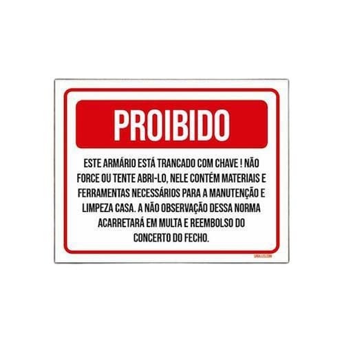 Com a placa Proibido Armário Trancado Não Abra 18x23, você terá a tranquilidade de saber que seus pertences estão seguros e protegidos. Não deixe de adquirir a sua!