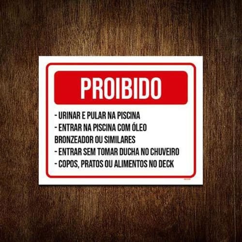 Características: - Placa decorativa Proibido Urinar Pular Piscina Óleo Bronzeador - Fabricadas em poliestireno de alto impacto - Ideal para decorar e organizar os ambientes - Impressão ultravioleta