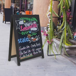 Cavalete Soft Prime Preto Duplo de Calçada 80x60cm comabertura 35cm com acabamento em madeira MDF Soft Prime revestido com melamina Superfície para uso exporádico em calçadas de restaurantes, bares, shoppings e lojas.
