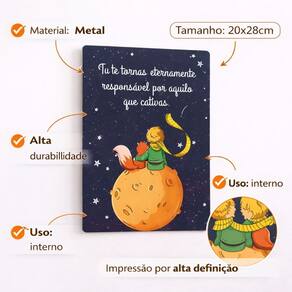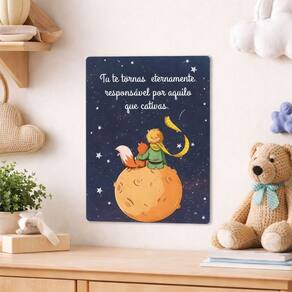 Decoração Afetiva Que Transforma o Quarto do Seu Bebê Criar o quarto do bebê é mais do que decorar — é construir memórias, afeto e um ambiente seguro e acolhedor.A Placa Quadro Metal Tema Pequeno Príncipe foi pensada para pais que desejam delicadeza, significado e encanto desde os primeiros dias de vida. Inspirada em um dos contos mais amados do mundo, essa peça traz ternura, imaginação e aconchego, tornando o quarto infantil mais especial e cheio de personalidade. Por que essa placa é a escolha ideal? Decoração infantil delicada e atemporal Tema Pequeno Príncipe, clássico e afetivo Ideal para quarto de bebê e infantil Material em metal resistente e durável Leve, fácil de pendurar e reposicionar Perfeita para presente de chá de bebê ou maternidade Onde usar? Quarto de bebê Quarto infantil masculino Cantinho do berço Parede decorativa Composição com outros quadros infantis Presente para recém-nascido Essa peça se adapta facilmente a ambientes minimalistas, clássicos ou lúdicos, sem poluir visualmente o espaço. Detalhes do Produto Tipo: Placa decorativa em metal Estilo: Infantil / Lúdico / Afetivo Tema: Pequeno Príncipe Aplicação: Parede Indicação: Bebês e crianças PERGUNTAS FREQUENTES (FAQ) 1. É seguro para quarto de bebê? Sim. A placa é leve, sem partes cortantes aparentes e indicada para ambientes infantis. 2. O produto já vai pronto para pendurar? Sim. É uma peça leve e fácil de instalar, podendo ser fixada com fita dupla face ou suporte adequado. 3. Combina com qualquer decoração infantil? Sim. O tema é clássico e neutro, combinando com diferentes estilos de quarto infantil e bebê. 4. Posso usar como presente? Sim. É uma excelente opção para chá de bebê, maternidade ou presente de nascimento. 5. O material é resistente? Sim. Produzida em metal, oferece maior durabilidade em comparação a quadros de papel ou MDF. Um detalhe pequeno que faz uma grande diferença