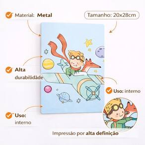 Decoração Afetiva Que Transforma o Quarto do Seu Bebê Criar o quarto do bebê é mais do que decorar — é construir memórias, afeto e um ambiente seguro e acolhedor.A Placa Quadro Metal Tema Pequeno Príncipe foi pensada para pais que desejam delicadeza, significado e encanto desde os primeiros dias de vida. Inspirada em um dos contos mais amados do mundo, essa peça traz ternura, imaginação e aconchego, tornando o quarto infantil mais especial e cheio de personalidade. Por que essa placa é a escolha ideal? Decoração infantil delicada e atemporal Tema Pequeno Príncipe, clássico e afetivo Ideal para quarto de bebê e infantil Material em metal resistente e durável Leve, fácil de pendurar e reposicionar Perfeita para presente de chá de bebê ou maternidade Onde usar? Quarto de bebê Quarto infantil masculino Cantinho do berço Parede decorativa Composição com outros quadros infantis Presente para recém-nascido Essa peça se adapta facilmente a ambientes minimalistas, clássicos ou lúdicos, sem poluir visualmente o espaço. Detalhes do Produto Tipo: Placa decorativa em metal Estilo: Infantil / Lúdico / Afetivo Tema: Pequeno Príncipe Aplicação: Parede Indicação: Bebês e crianças PERGUNTAS FREQUENTES (FAQ) 1. É seguro para quarto de bebê? Sim. A placa é leve, sem partes cortantes aparentes e indicada para ambientes infantis. 2. O produto já vai pronto para pendurar? Sim. É uma peça leve e fácil de instalar, podendo ser fixada com fita dupla face ou suporte adequado. 3. Combina com qualquer decoração infantil? Sim. O tema é clássico e neutro, combinando com diferentes estilos de quarto infantil e bebê. 4. Posso usar como presente? Sim. É uma excelente opção para chá de bebê, maternidade ou presente de nascimento. 5. O material é resistente? Sim. Produzida em metal, oferece maior durabilidade em comparação a quadros de papel ou MDF. Um detalhe pequeno que faz uma grande diferença