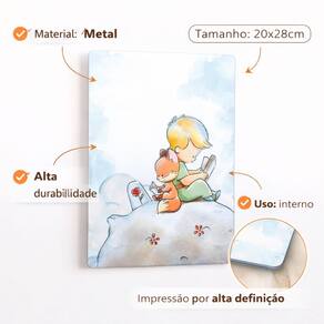 Decoração Afetiva Que Transforma o Quarto do Seu Bebê Criar o quarto do bebê é mais do que decorar — é construir memórias, afeto e um ambiente seguro e acolhedor.A Placa Quadro Metal Tema Pequeno Príncipe foi pensada para pais que desejam delicadeza, significado e encanto desde os primeiros dias de vida. Inspirada em um dos contos mais amados do mundo, essa peça traz ternura, imaginação e aconchego, tornando o quarto infantil mais especial e cheio de personalidade. Por que essa placa é a escolha ideal? Decoração infantil delicada e atemporal Tema Pequeno Príncipe, clássico e afetivo Ideal para quarto de bebê e infantil Material em metal resistente e durável Leve, fácil de pendurar e reposicionar Perfeita para presente de chá de bebê ou maternidade Onde usar? Quarto de bebê Quarto infantil masculino Cantinho do berço Parede decorativa Composição com outros quadros infantis Presente para recém-nascido Essa peça se adapta facilmente a ambientes minimalistas, clássicos ou lúdicos, sem poluir visualmente o espaço. Detalhes do Produto Tipo: Placa decorativa em metal Estilo: Infantil / Lúdico / Afetivo Tema: Pequeno Príncipe Aplicação: Parede Indicação: Bebês e crianças PERGUNTAS FREQUENTES (FAQ) 1. É seguro para quarto de bebê? Sim. A placa é leve, sem partes cortantes aparentes e indicada para ambientes infantis. 2. O produto já vai pronto para pendurar? Sim. É uma peça leve e fácil de instalar, podendo ser fixada com fita dupla face ou suporte adequado. 3. Combina com qualquer decoração infantil? Sim. O tema é clássico e neutro, combinando com diferentes estilos de quarto infantil e bebê. 4. Posso usar como presente? Sim. É uma excelente opção para chá de bebê, maternidade ou presente de nascimento. 5. O material é resistente? Sim. Produzida em metal, oferece maior durabilidade em comparação a quadros de papel ou MDF. Um detalhe pequeno que faz uma grande diferença