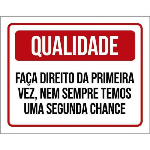 Placa Qualidade Faça Direito Da Primeira Vez 36x46 Informações do Produto: Placas decorativas fabricadas com poliestireno de alto impacto PSAI de 2mm e impressão ultravioleta. - Medidas: 36cm x 46cm - Fixação: Todas as placas possuem adesivo dupla face para aplicação em qualquer tipo de superfície lisa. de 12 meses e disponibilidade imediata. Marca: Não Informado Ean: 7794722533511