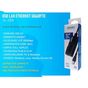 Marca: Exbom Modelo: UL-1200 Condição: Novo Conexão: USB 3.0 Conector: RJ45 Suporte: Gigabit Comprimento Cabo: 18cm Velocidade: 10/100/1000Mbps Compatibilidade: USB 1.0 / 2.0 / 3.0 Altura: 3cm Largura: 3cm Peso: 34g Comprimento: 9,5cm + 18cm Cabo Suporta Full-Duplex e Half-Duplex Ethernet Sistemas compatíveis: Windows, MacOs, Chrome Os Dispositivos compatíveis: Computador, Notebook, Netbook, MacAir Dispositivo compacto, pode ser levado para qualquer lugar Instalação Rápida e Fácil com Plug and Play