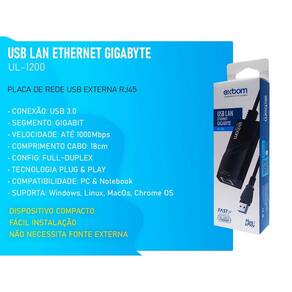 Marca: Exbom Modelo: UL-1200 Condição: Novo Conexão: USB 3.0 Conector: RJ45 Suporte: Gigabit Comprimento Cabo: 18cm Velocidade: 10/100/1000Mbps Compatibilidade: USB 1.0 / 2.0 / 3.0 Altura: 3cm Largura: 3cm Peso: 34g Comprimento: 9,5cm + 18cm Cabo Suporta Full-Duplex e Half-Duplex Ethernet Sistemas compatíveis: Windows, MacOs, Chrome Os Dispositivos compatíveis: Computador, Notebook, Netbook, MacAir Dispositivo compacto, pode ser levado para qualquer lugar Instalação Rápida e Fácil com Plug and Play